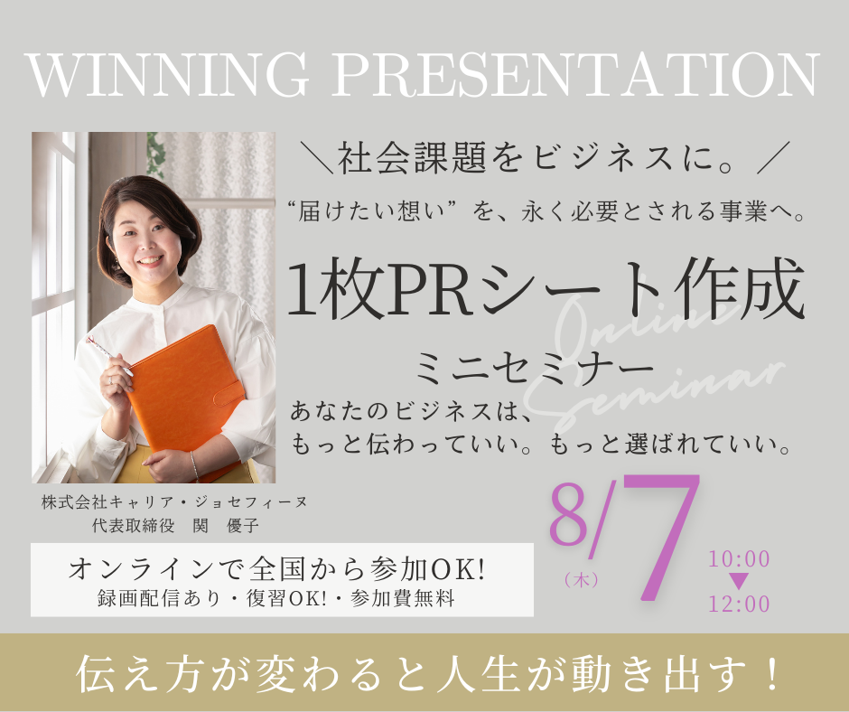 ◎お申し込み確定後、『PRシート』をお送りいたします。ご記入の上、当日ご持参ください。 PRシートの作成が難しい方には、無料でPRシート作成セミナーにご案内! サポートを受けて、ベストなPRシートを作成しましょう! |