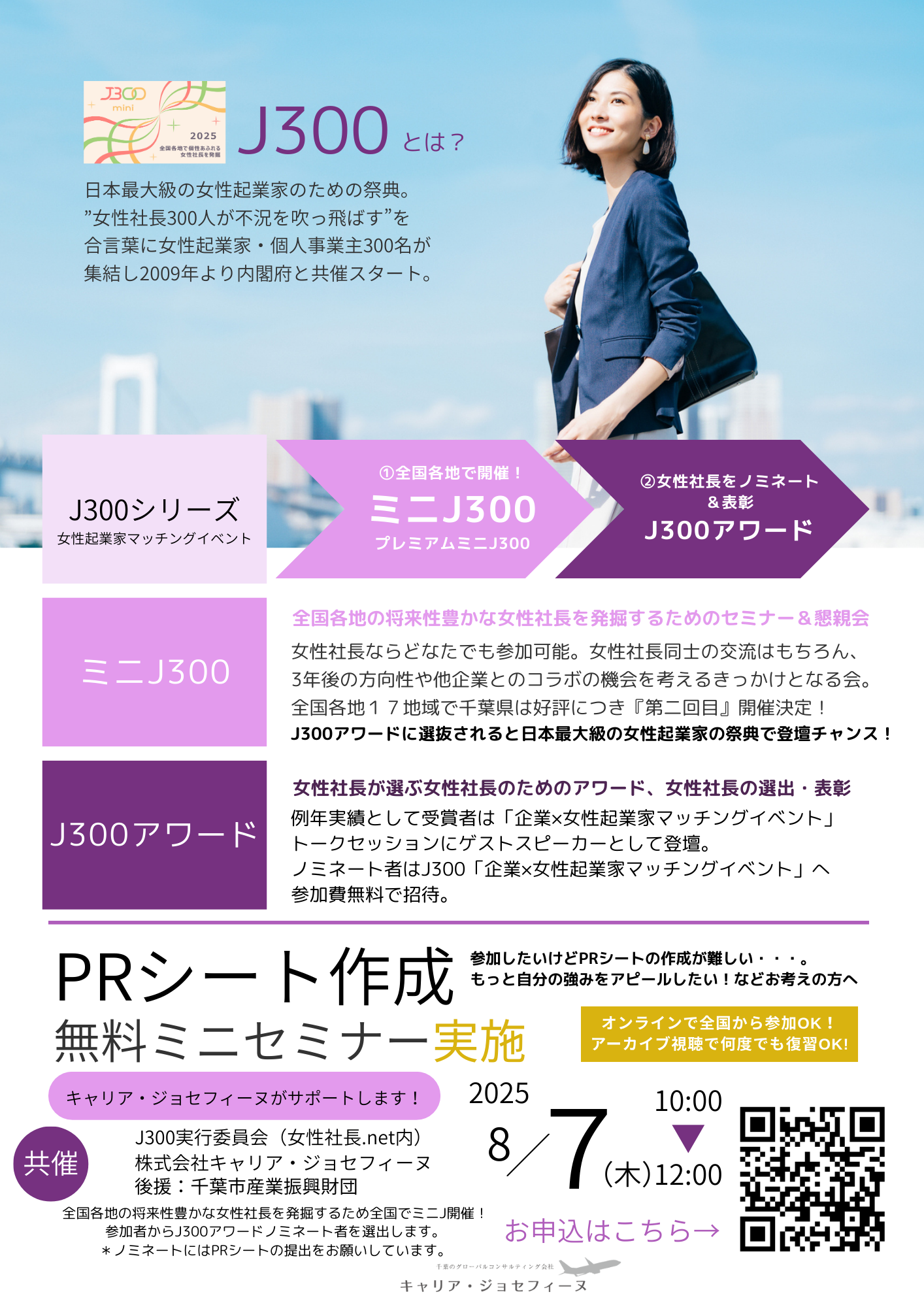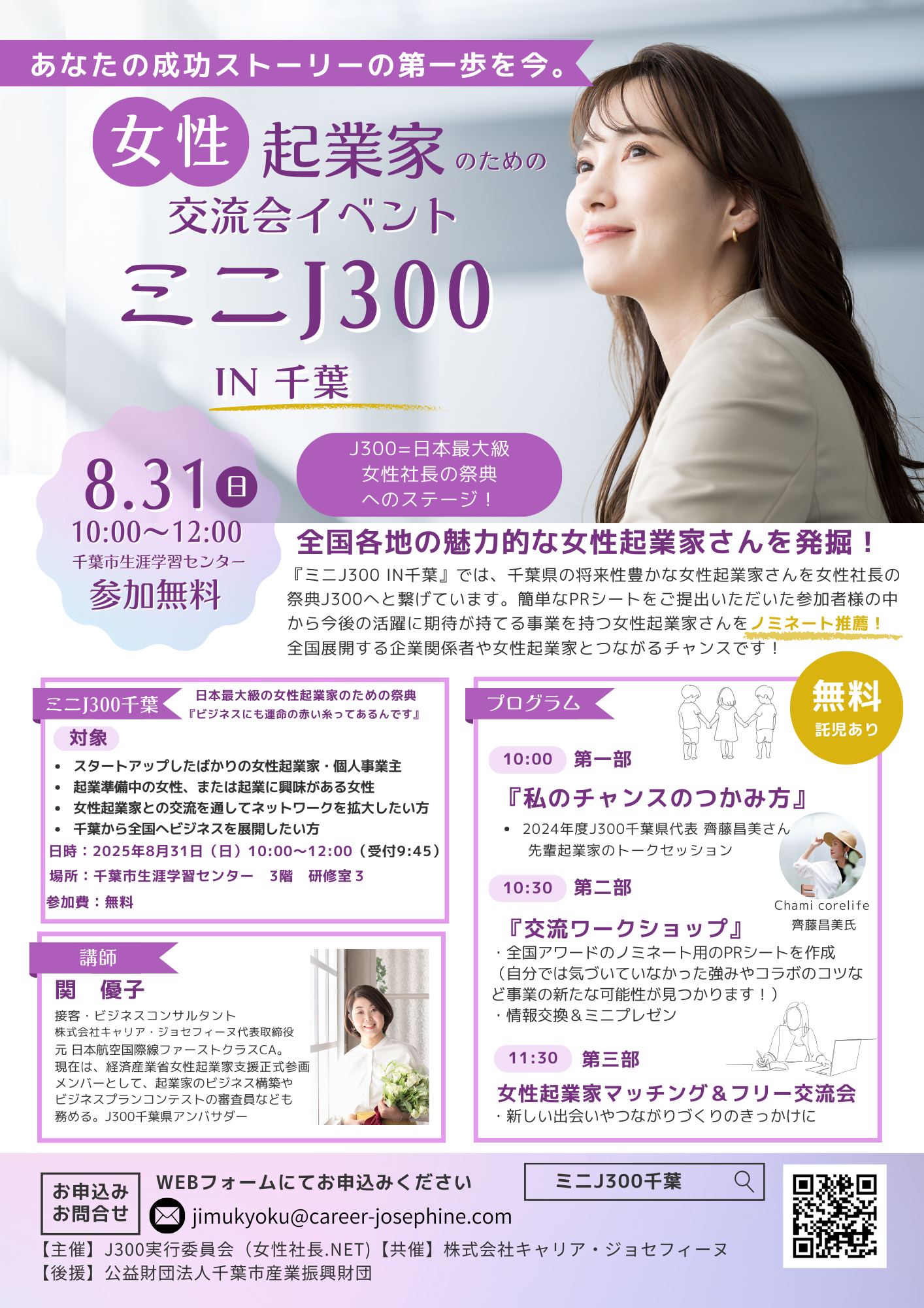 ①2024年度千葉県代表 齊藤昌美さんトークセッション『私のチャンスのつかみ方』(30分) ②ワークショップ 女性社長の祭典J300アワードノミネートのPRシートを作成(60分) ③女性起業家マッチング&名刺交換交流会(30分) |